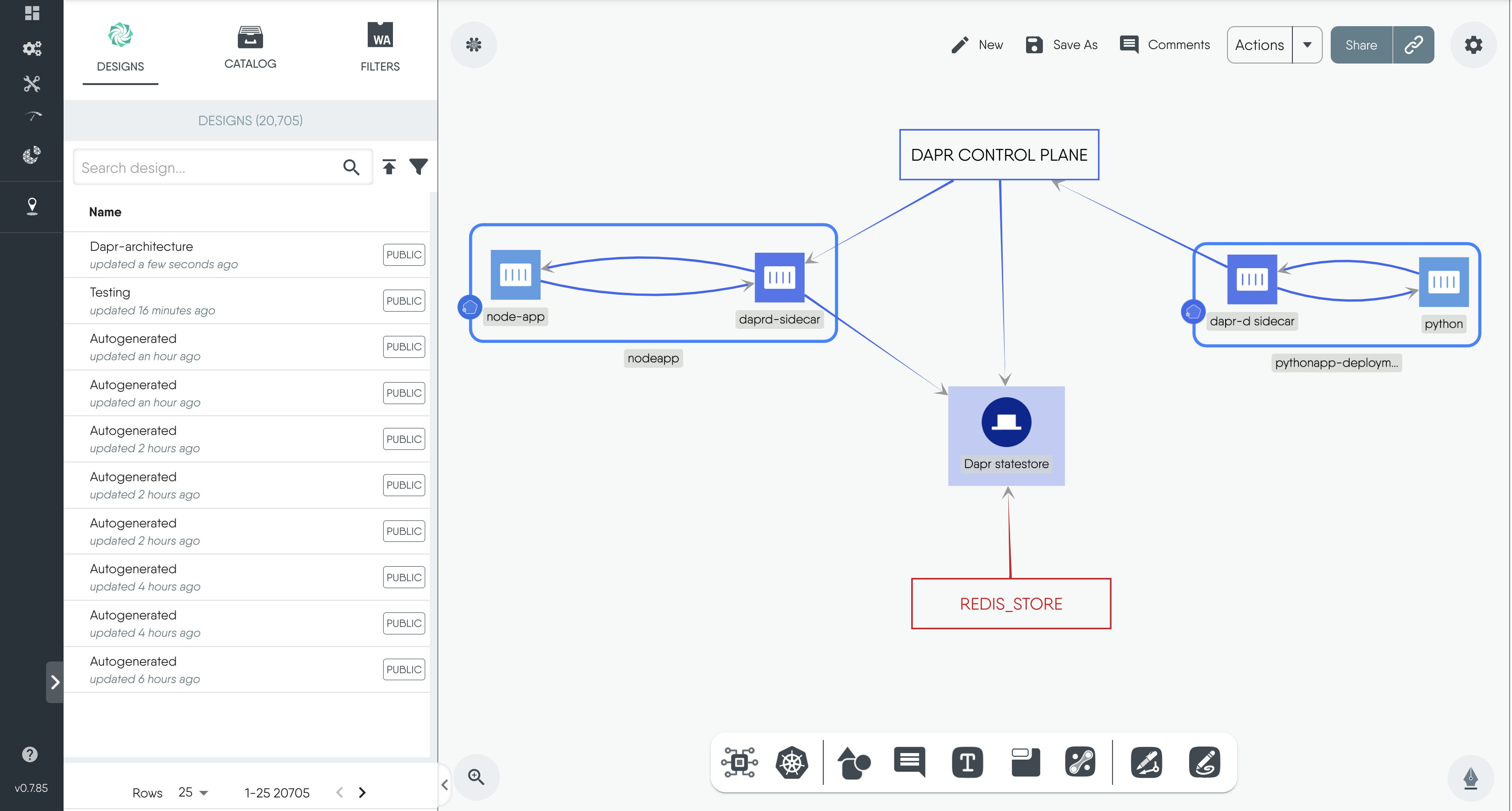 Meshery’s Kanvas visualization capabilities allow you to examine the components involved in this architecture and understand their relationships. This breakdown helps you see how Dapr interacts with the applications, enhancing your comprehension of its functionality.