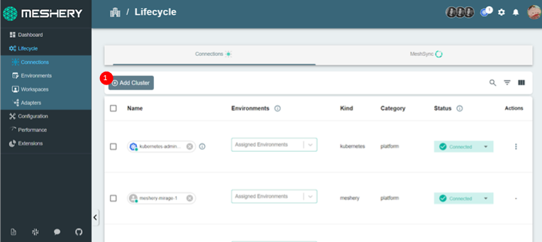 Examples of connections managed by Meshery include GitHub integrations, Prometheus connections, Kubernetes clusters, and more. It’s essential to assign these connections to an environment and link that environment to your selected workspace.