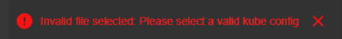 If you uploaded an invalid kubeconfig file, you might see an error message statement like the one below. Please ensure you are uploading the correct file with the proper configuration and try again.